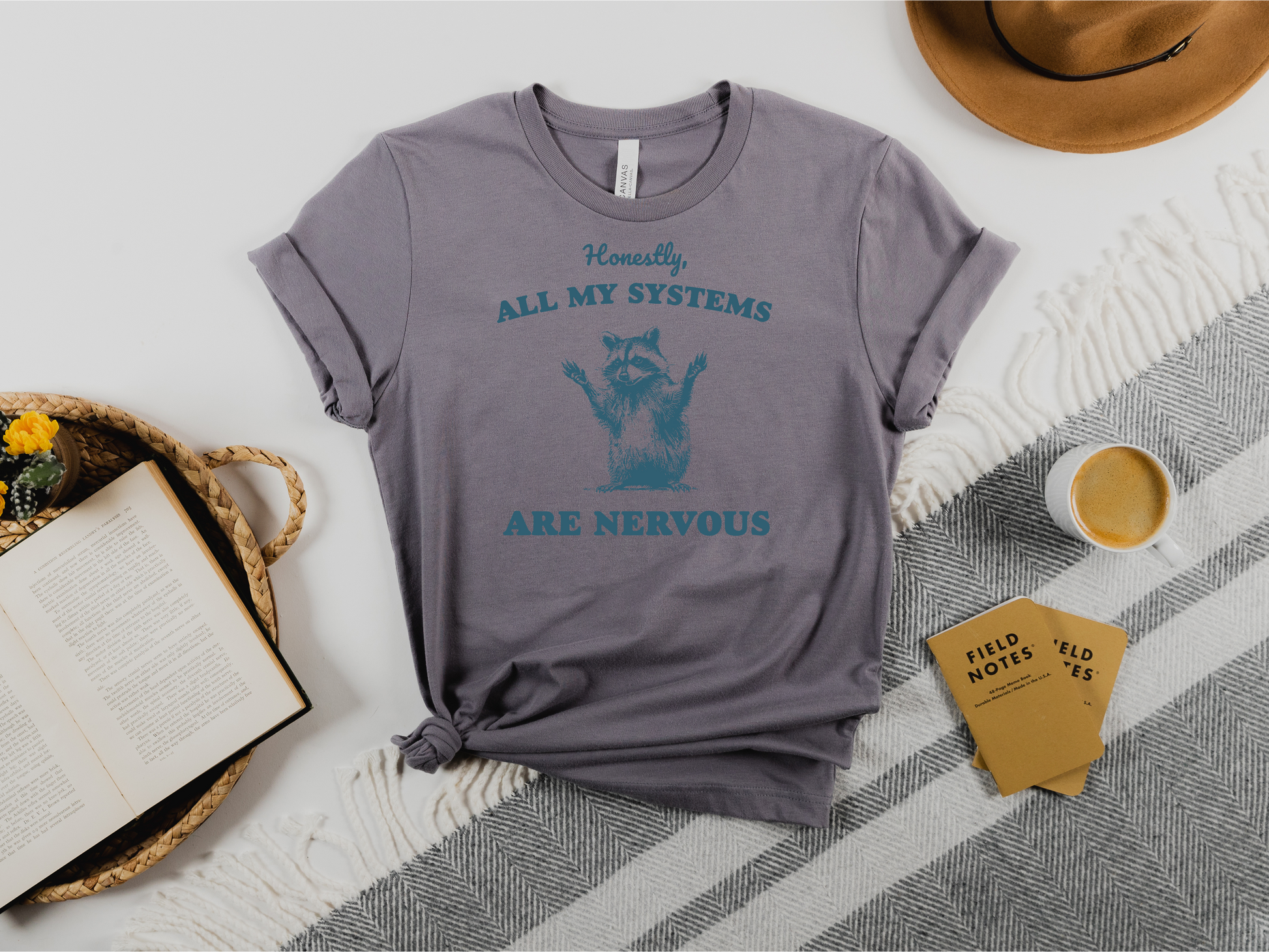 Anxiety? Overthinking? General life chaos? Same. Our Honestly, All My Systems Are Nervous tee says what we’re all thinking—but with a lot more charm and a dash of humor. Featuring an adorably frantic raccoon throwing its hands up in surrender to life’s nonsense, this tee is the perfect way to laugh through the overwhelm.