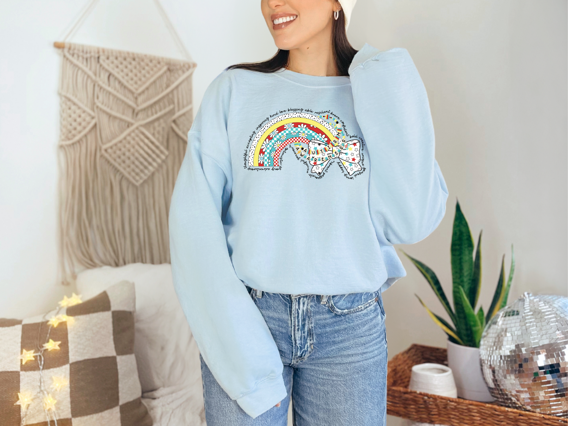Show your support for Autism Awareness in the most colorful and cozy way with our Autism Awareness Rainbow Sweater. Featuring a vibrant rainbow and bow design filled with words like "understanding," "love," and "acceptance," this sweater is a perfect tribute to the neurodiverse community.