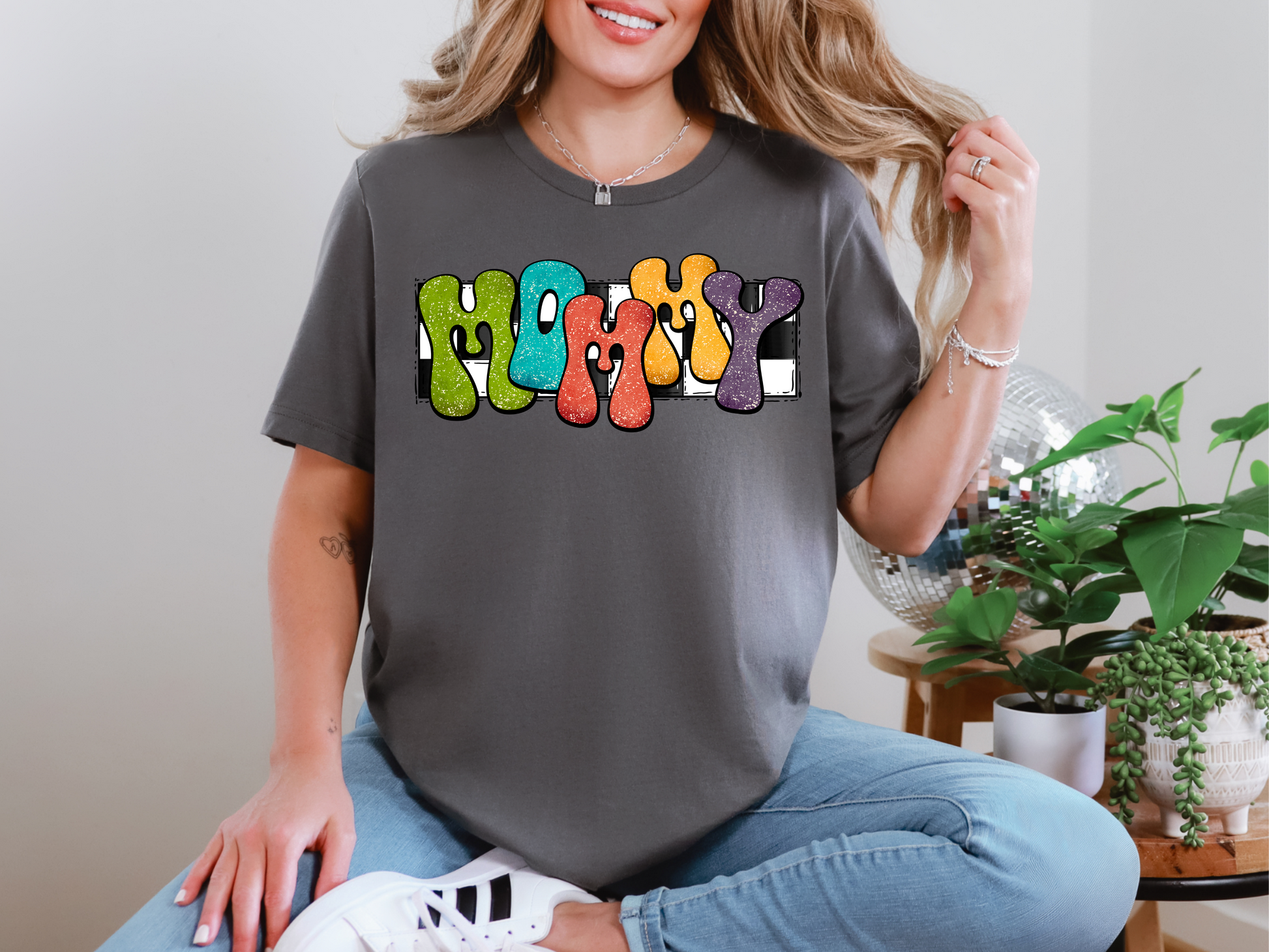 Add a splash of color to your family fun with our vibrant "Mommy, Daddy, and Mini" matching tee collection! These bold, bubble-letter designs are set against a trendy black-and-white checkered background, bringing a groovy, retro vibe with a modern twist. Whether you're headed to a theme park, taking family photos, or just matching for fun around the house—these tees are made to make a statement.