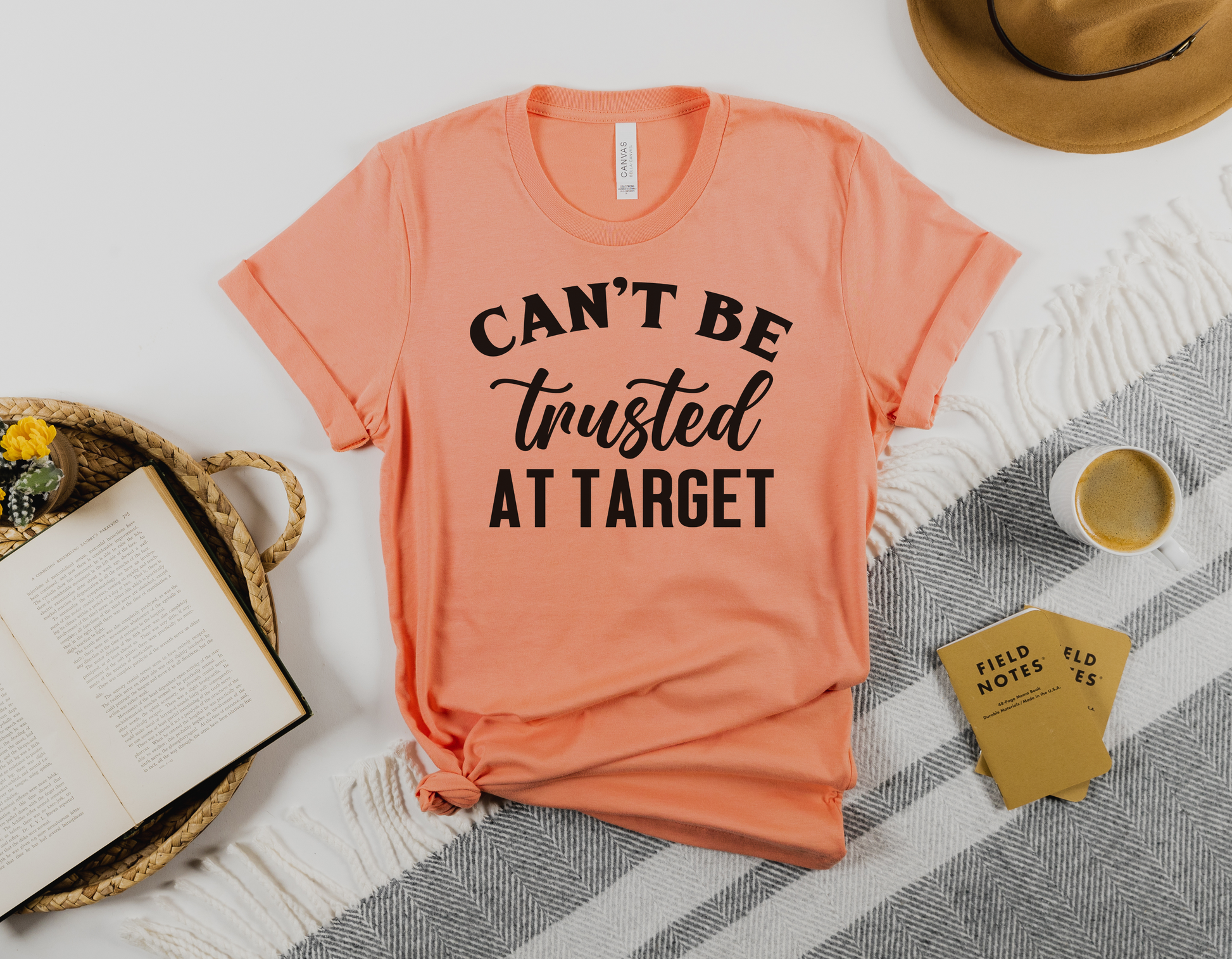 Featuring a fun and playful design with the catchy phrase "Can't Be Trusted At Target" printed on the front, this t-shirt is sure to make a statement wherever you go. It's made from high-quality, soft and comfortable fabric that feels great against the skin, making it perfect for everyday wear.