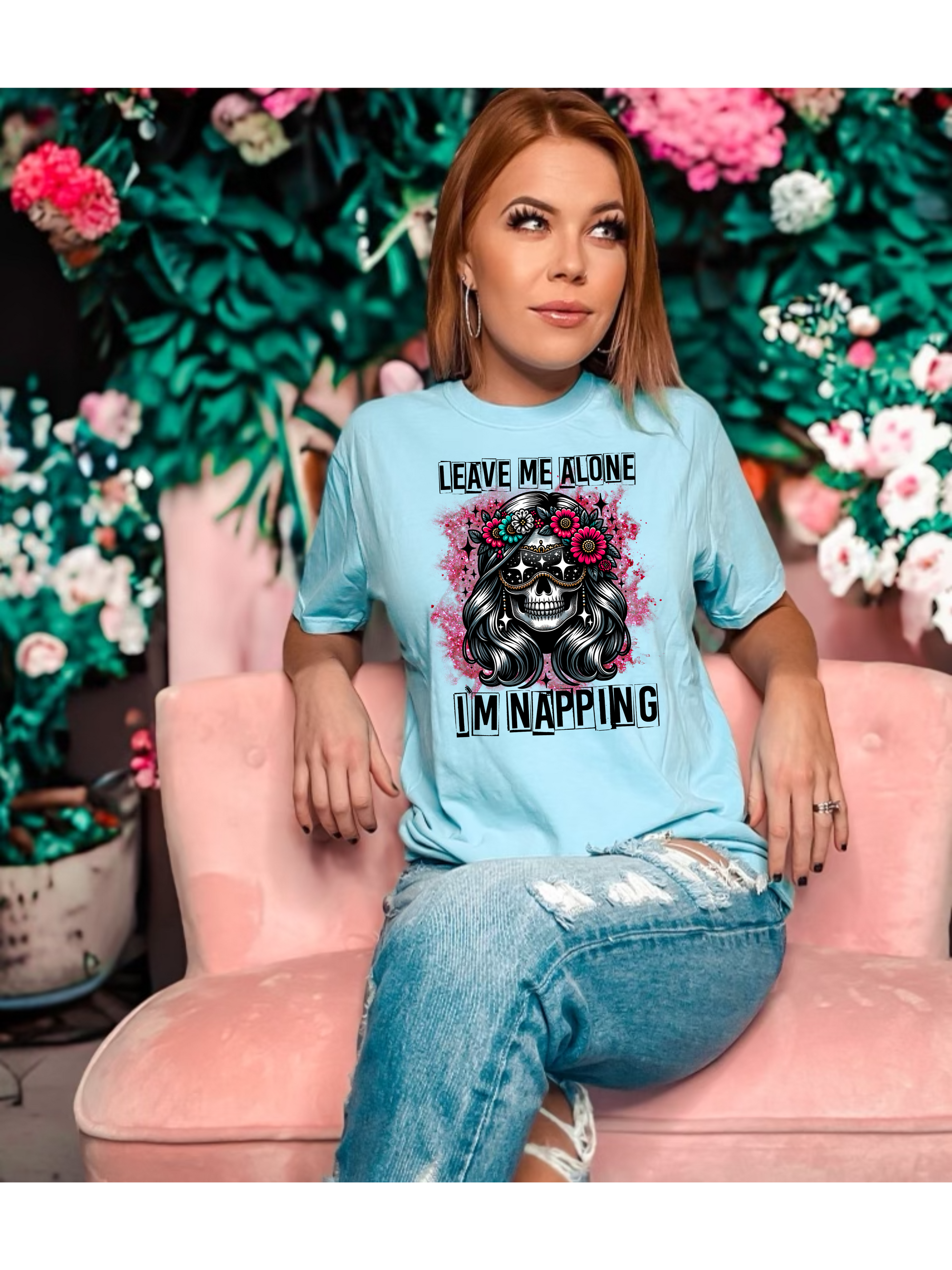 Because some of us run on caffeine, chaos, and naps. Say it loud (while you snooze proud) in our “Leave Me Alone I’m Napping” tee. Featuring a fierce sugar skull beauty decked in florals and attitude, this shirt is your official do-not-disturb sign—with style.