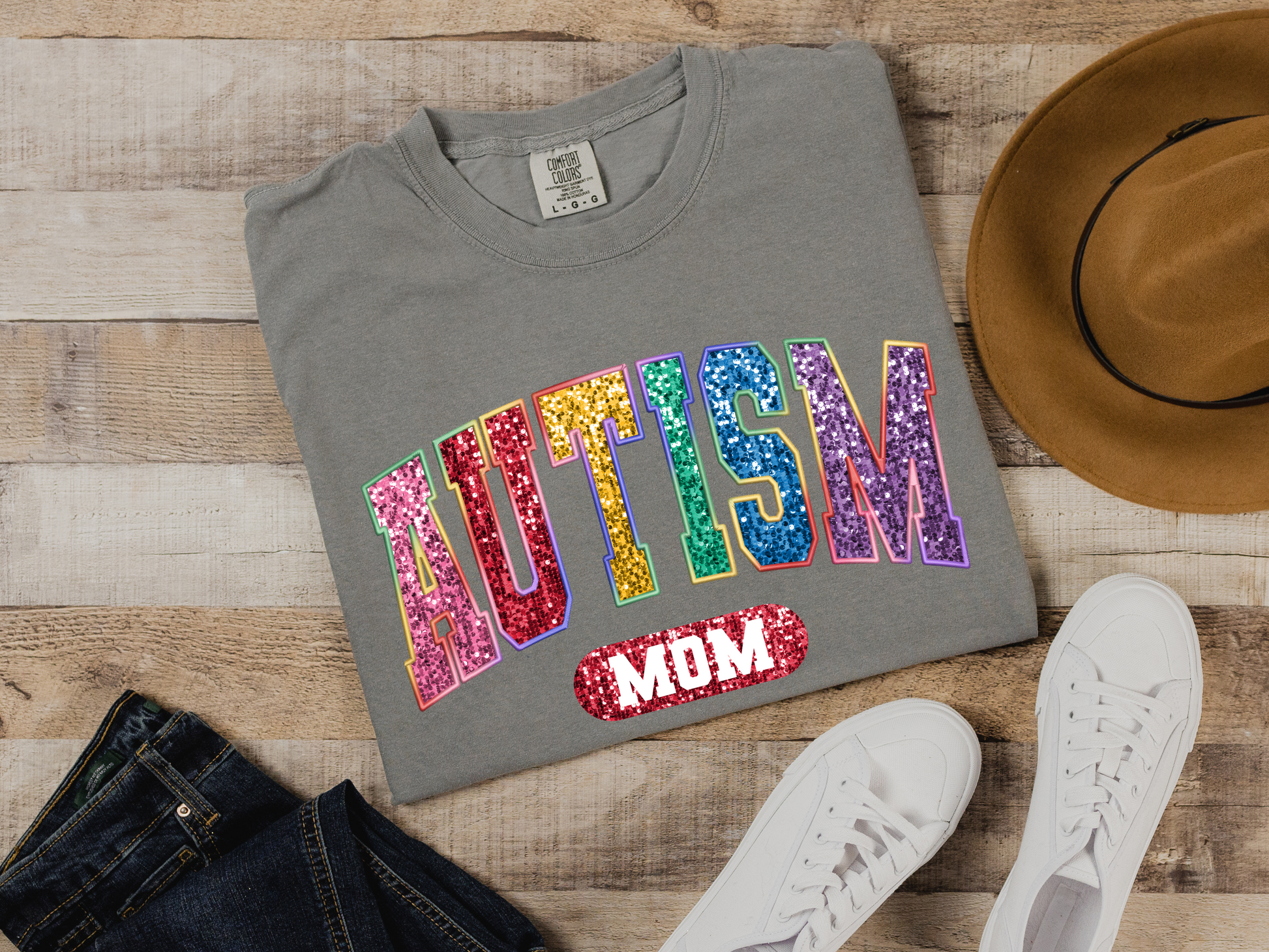 Show off your pride and love for your child with this stunning Autism Mom tee. Featuring sparkling, colorful letters that spell out "AUTISM" in a rainbow of glittering colors, and a bold "MOM" at the bottom, this shirt is as vibrant and beautiful as the love you have for your little one.
