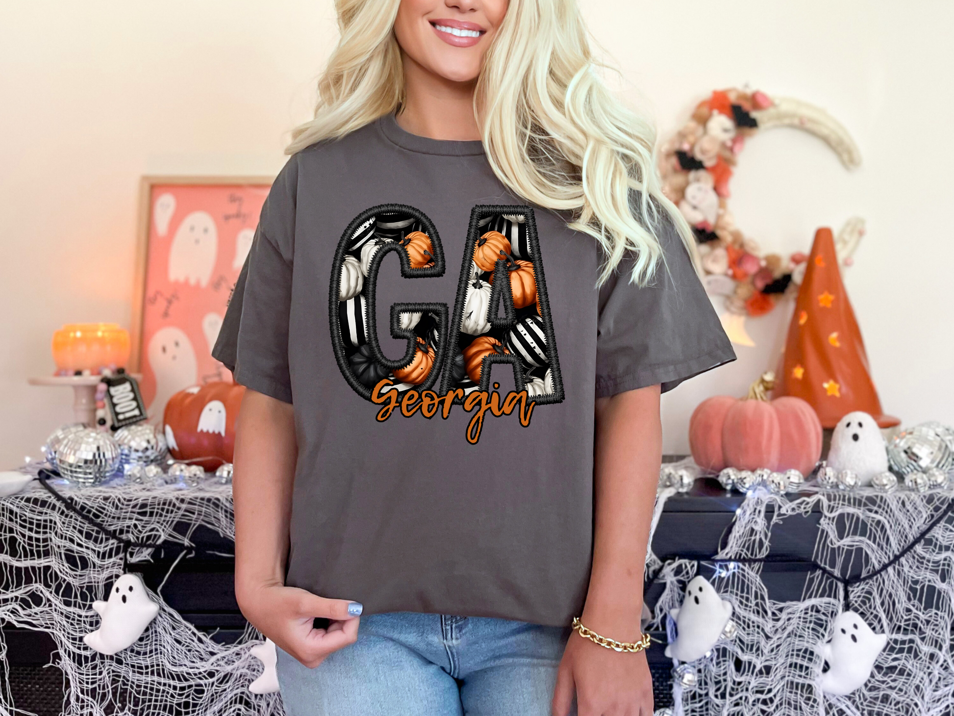 The playful pumpkins bring a pop of autumn charm, while the handwritten state, adds just the right touch of sweetness. Whether you're hitting the pumpkin patch, decorating your porch, or heading out for fall festivals, this tee is your comfy go-to for all things October.