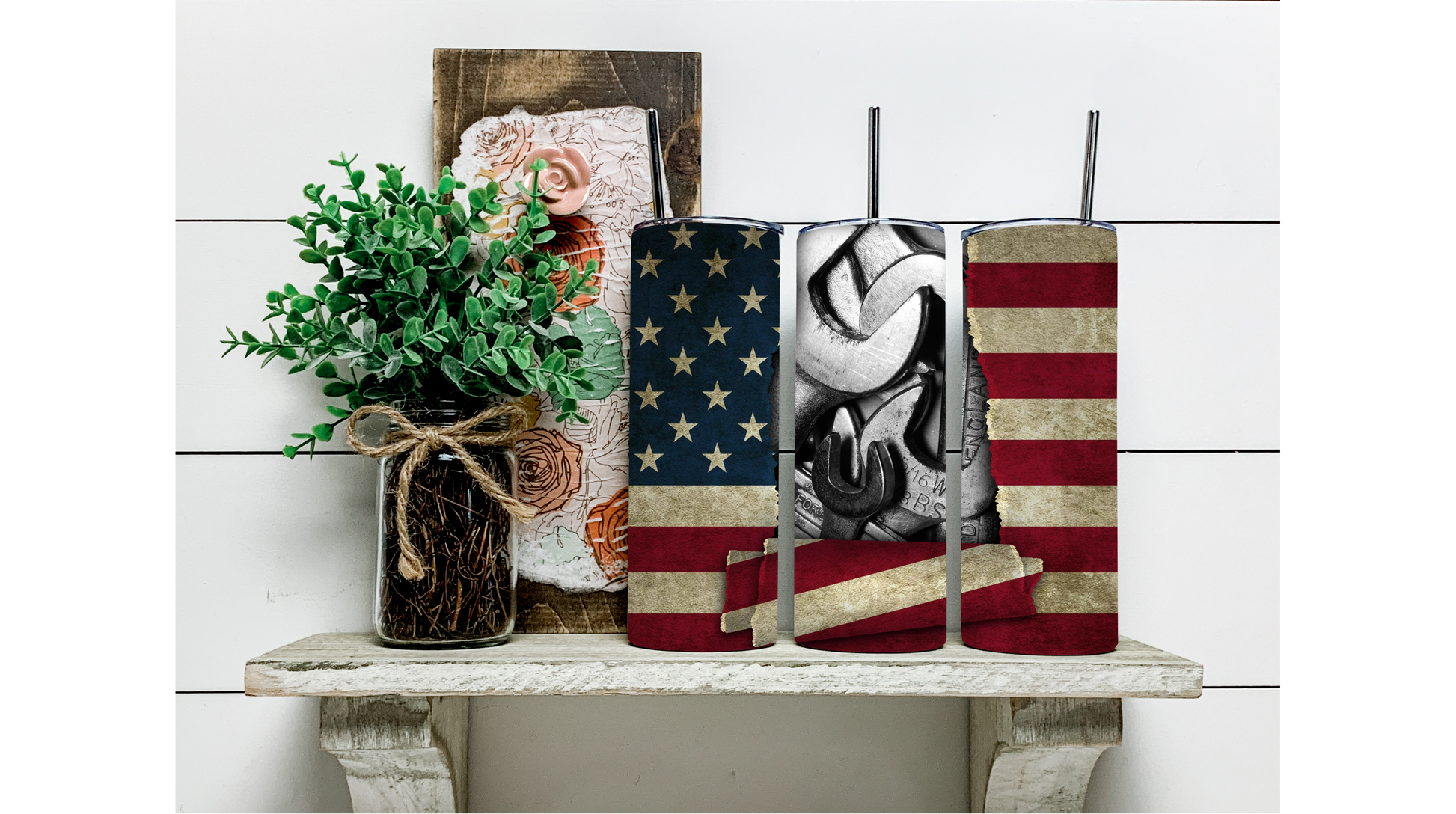 But what really sets our American Flag Mechanic Tumbler apart is its striking design. Featuring a bold American flag and wrenches crossed over it, this tumbler is sure to turn heads and start conversations wherever you go.